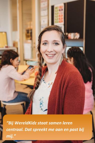 "Bij WereldKidz staat samen leren en een gezamenlijke verantwoordelijkheid centraal. Je ziet het terug op team, cluster en stichtingsniveau. Je staat er niet alleen voor. Dat spreekt me aan en past bij mij. Er heerst een open en positieve sfeer. Iedereen heeft daar zijn/ haar eigen aandeel in en we doen het met z’n allen."