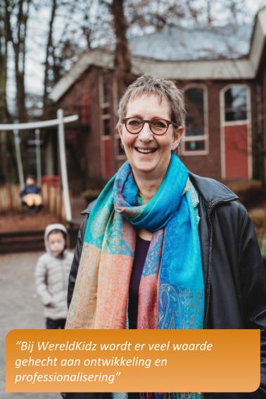 "Bij WereldKidz wordt er veel waarde gehecht aan ontwikkeling en professionalisering. Je wordt gestimuleerd om eigenaar te zijn van je eigen ontwikkeling. Ik wordt uitgenodigd na te denken waar ik me in wil verdiepen en waar mijn interesses liggen. Het zet me aan om verder te zoeken en bezig te blijven.”