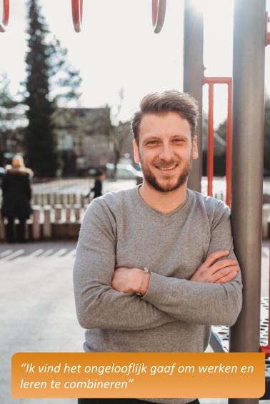 "Ik vind het fantastisch dat ik deze kans krijg en het is ongelooflijk gaaf om op deze manier te leren. Ik kan al mijn opdrachten gelijk in de praktijk brengen. Af en toe is de combinatie best pittig maar inmiddels heb ik een goed ritme. Ik ontwikkel mij in rap tempo als leraar.”