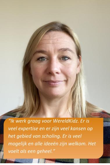 “Ik werk graag voor WereldKidz. Er is veel expertise en er zijn veel kansen op het gebied van scholing. Er is veel mogelijk en alle ideeën zijn welkom. Het voelt als een geheel. We zijn vrij om onze school op een eigen manier vorm te geven. Dat is heel enthousiasmerend en geeft het vertrouwen om het ook echt neer te zetten. De leraren voelen dat. Ik laat ze zelf kiezen omdat zij zien wat werkt en het moeten doen. Ze zijn echt eigenaar van wat ze doen.”